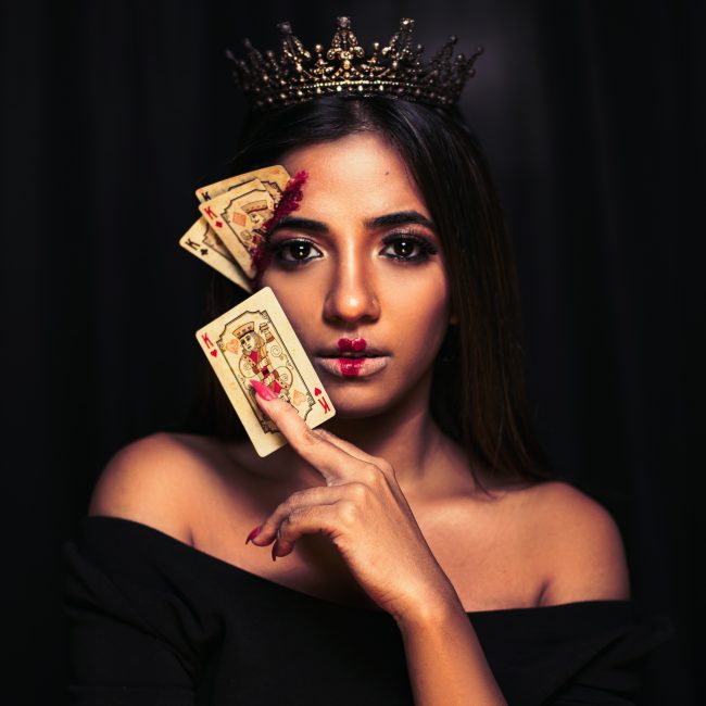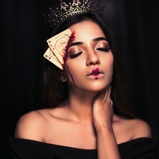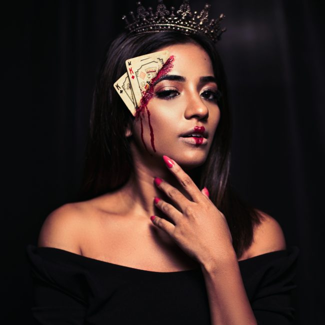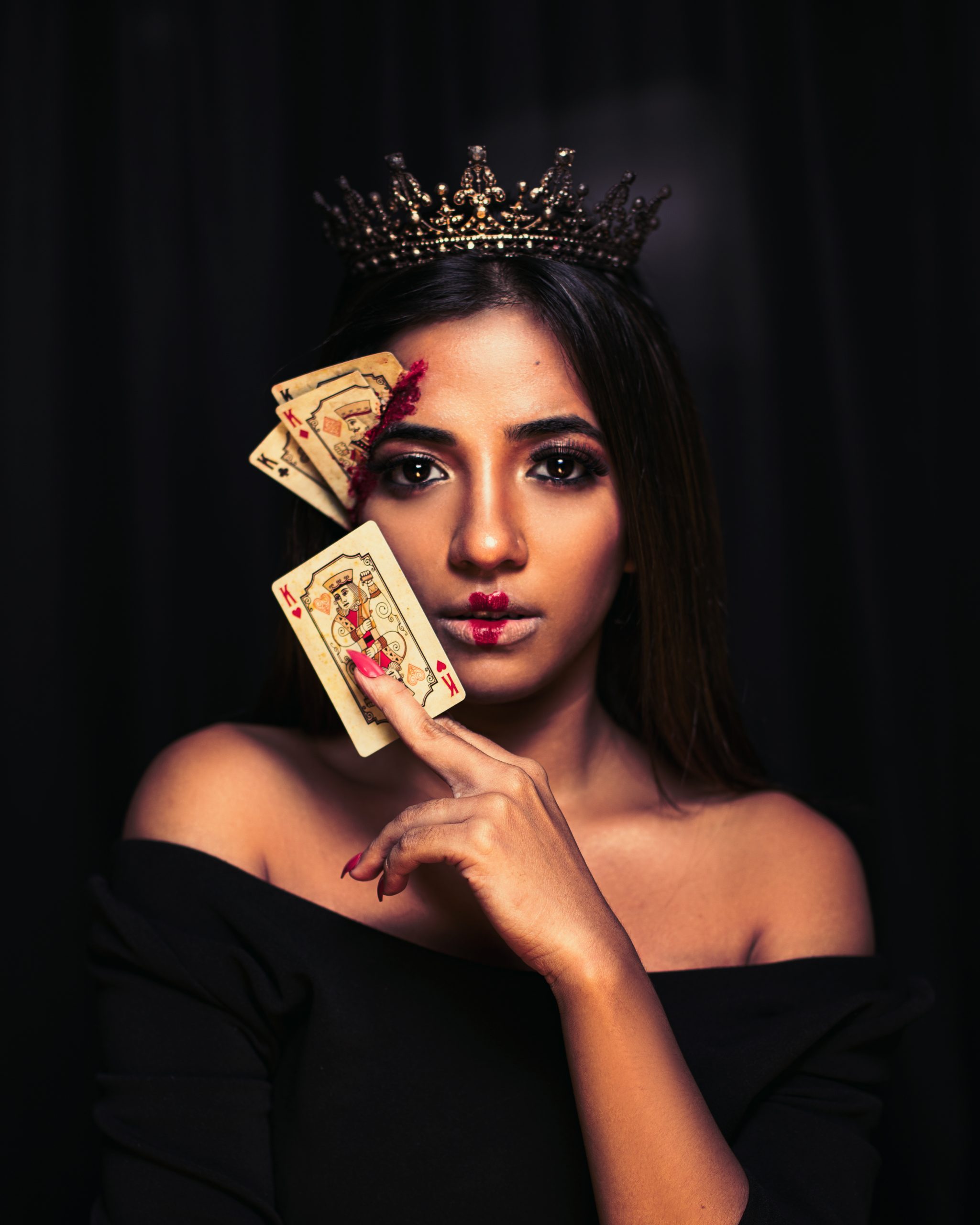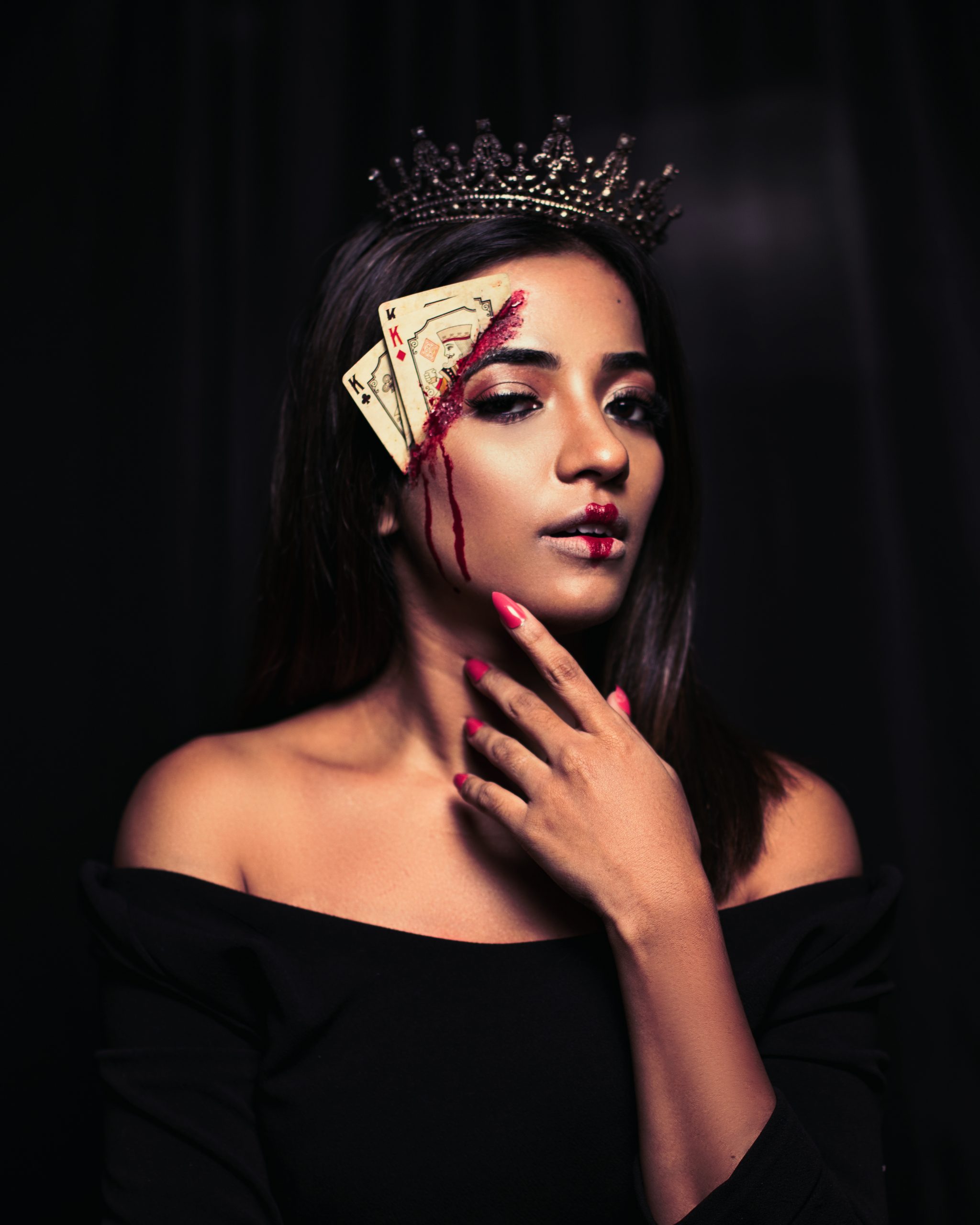 Conceptual portraiture art photoshoot titled ‘Queen Of Hearts’. A dark theme based on a queen who is just looking for her king who could see beauty in her darkness!